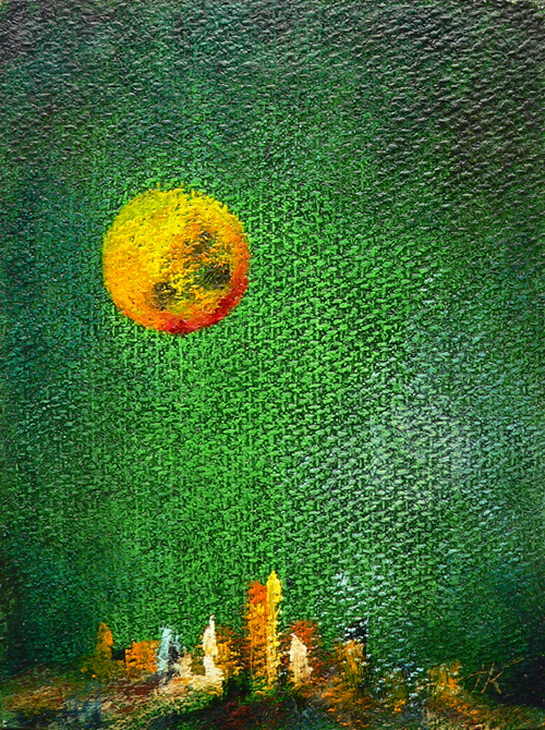 A "Az elveszett város" a második kép a festménysorozatból. A láthatatlan energiák képi megjelenítésére törekszik. A zöld szín a jutta vászon strukturáján keresztül vibrál ezen a fetményen. Mesés energiával önti el a nézelődőt. Változó fényben változó érzelmeket kavar. Nagyon különleges átélni az érzelmek változását a különböző megvilágításokban. Az alkotás a látogatót egy olyan utazásra invitálja, ahol az érzelmek szabadon szárnyalhatnak.