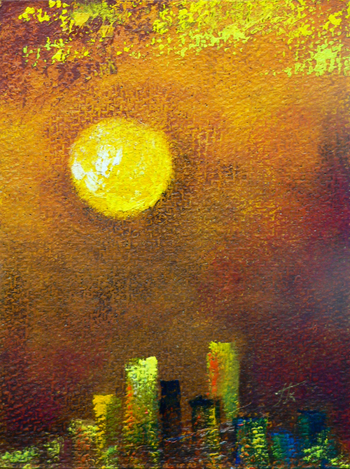 "Az elveszett város 6" a második kép a festménysorozatból. A láthatatlan energiák képi megjelenítésére törekszik. A zöld szín a jutta vászon strukturáján keresztül vibrál ezen a fetményen. Mesés energiával önti el a nézelődőt. Változó fényben változó érzelmeket kavar. Nagyon különleges átélni az érzelmek változását a különböző megvilágításokban. Az alkotás a látogatót egy olyan utazásra invitálja, ahol az érzelmek szabadon szárnyalhatnak.
