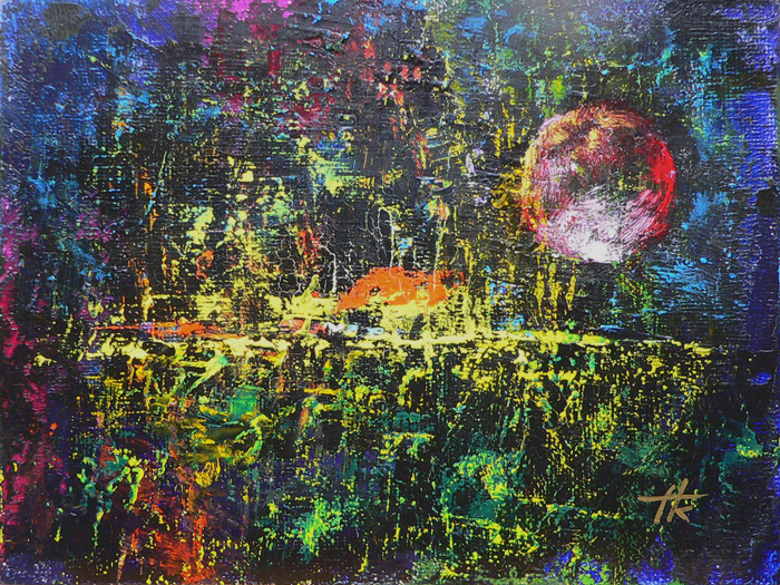 A "Cikázó fények" című festményem a láthatatlan energiák képi megjelenítésére törekszik. A kékés a lila szín ezernyi variációja vibrál ezen a vásznon, mesés energiával önti el a nézelődőt. Változó fényben változó érzelmeket kavar.